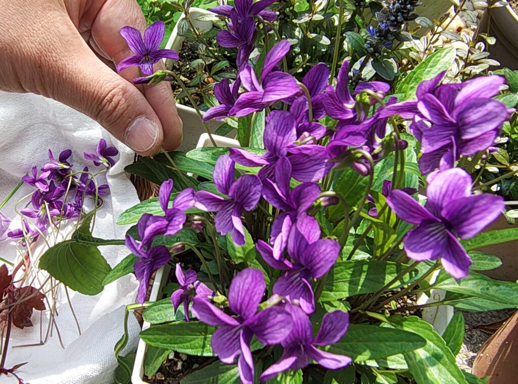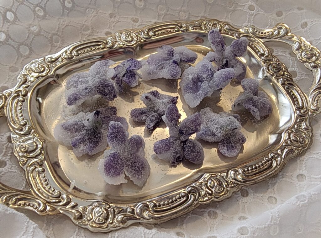 花を摘む時間も、砂糖の衣が乾くのをのんびり待つ時間も、ガラス瓶に入れて眺める時間も、どれも小さな楽しみです。そっと口に入れると、シャリシャリとした甘さとともに、ふんわりとスミレの香りが広がり、心がふっと緩みます。