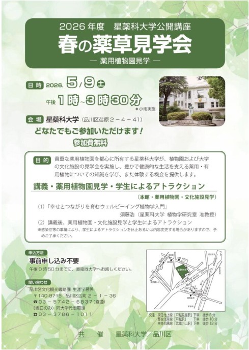 | 内容 | 講義・薬用植物園見学・学生によるアトラクション等 (1)「幸せとつながりを育むウェルビーイング植物学入門」須藤 浩(星薬科大学 植物学研究室 准教授) (2)講義後、薬用植物園・文化施設見学と学生によるアトラクション ※感染症等の事情により、学生によるアトラクションを休止あるいは内容変更する場合がありますので、予めご了承ください。 |